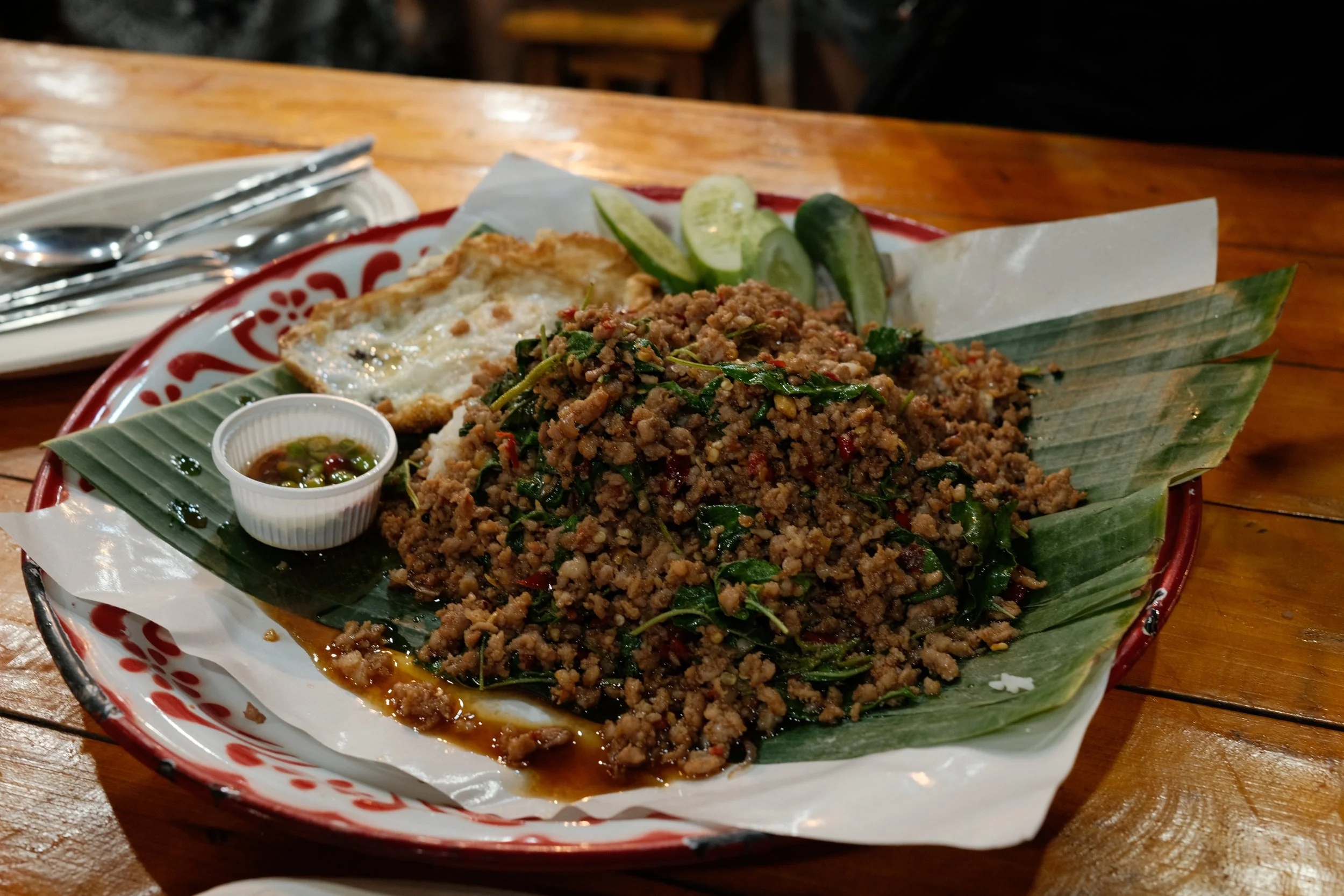 That night my roommate, Louis, arrived. We went to Train Night Market Srinagarindra for dinner. After walking around this huge market filled with vintage clothes and street food, we came across this big stall with a lot of locals. We thought this would be the best place. We got a large order of Pad Kra Pao (didn’t even know what that was at the time), it was huge and delicious.