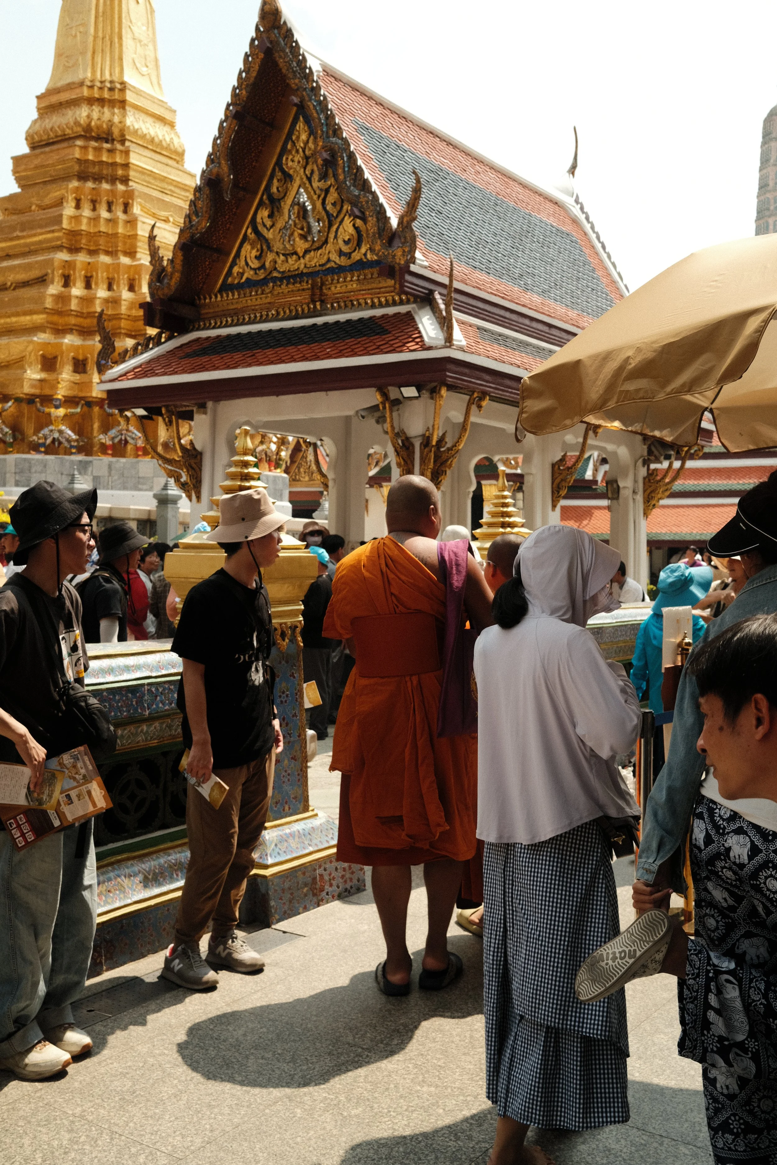 We started the next day in The Grand Palace, a complex of buildings at the heart of Bangkok and the official residence of the Kingdom. It was kind of hard to capture these huge temples, not only due to their size but also the crowds. I thought the crowds were also quite interesting, a mix of people taking selfies next to the temples, street sellers, monks, and tourists wearing the classic elephant pants. Writing this, I realize that I like to include people in my photographs, even if they are not the focus.